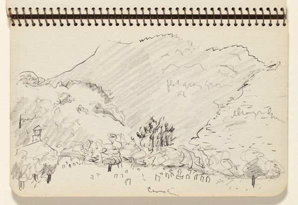 Curator: Here we have John Piper’s "Traeth Mawr," a small ink drawing held at the Harvard Art Museums. It’s a landscape, seemingly minimal. Editor: My initial impression is a sense of starkness, like a memory fading at the edges. The lack of color amplifies this. Curator: Piper often returned to the landscape, seeking to capture the genius loci, the spirit of a place. The sketchy lines almost feel like place markers, recording an emotional response. Editor: It's interesting how much Piper conveys with so little. The mountains, despite their simple outline, still feel monumental. Curator: Landscapes often symbolize the enduring power of nature. Perhaps Piper is hinting at a contrast between fleeting human experiences and the permanence of the land. Editor: It makes me think about how we often reduce grand experiences to simple sketches in our minds, yet they retain such power. Curator: Yes, precisely! The visual shorthand becomes its own powerful language. Editor: I’ll be thinking about this sketch for a while.