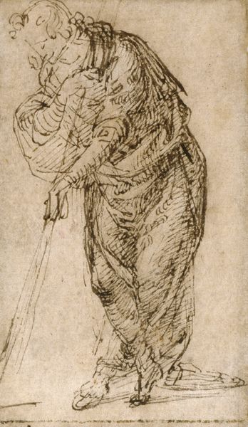 Simon Andreas Krausz created this drawing of a standing person with a child in their arms around the late 18th or early 19th century. The work uses ink on paper. The composition emphasizes verticality, with the figures elongated to fit within a narrow rectangular frame. Krausz’s use of fluid, almost calligraphic lines suggests a sense of movement and instability. Notice the monochromatic palette, limiting the drawing to shades of gray and brown, which creates a somber mood. The artist’s technique employs hatching and smudging to define form and volume, adding a tactile dimension. This work can be interpreted through the lens of structuralism, where the stark representation of figures challenges the traditional representation of idealized motherhood. Instead, Krausz focuses on the formal qualities of line and form. The sketch captures a raw, immediate depiction, stripping away conventional sentimentality. Ultimately, Krausz invites us to consider the fundamental structures of human representation. Here, the drawing is less about the emotional narrative, and more about exploring the visual language of art itself.