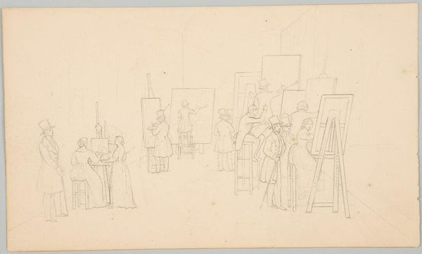 Curator: Here we have William Roberts' "Drop Curtain for the Camargo Ballet." Editor: It feels like a glimpse backstage, oddly still and frantic all at once. Curator: Note how Roberts uses precise geometric forms. The interplay of angles and lines creates a structured rhythm, almost like a Cubist dance itself. Editor: Yes, but there's also a human energy, a nervous anticipation sketched into the very bones of the dancers. I almost hear the tuning of instruments. Curator: The work beautifully merges geometric abstraction with figuration, achieving a balance between the mechanical and the organic. Editor: I leave this ballet rehearsal, wondering if the performance will ever actually begin or if this frozen moment is all we get to experience.