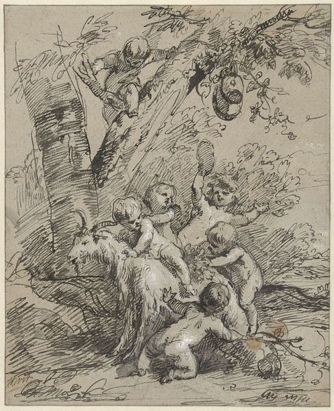 Editor: This print, "Drunken Bacchantes and Putti," comes to us from sometime in the 18th century. What really grabs my eye is the way the figures interact with the natural landscape around them, kind of like it's this whole playground made just for them. It makes me wonder, how do you view this interaction between figures and their surroundings in relation to art of this era? Curator: I see here an example of a very calculated exploitation of both material and idea. An engraving is a multiplication of the art object. These images were often disseminated widely through the culture, reaching a public who might never directly engage with painting or sculpture. In that distribution and consumption of images we must ask what's at play? Editor: Are you saying the act of reproducing it changes its artistic purpose? Curator: Precisely. Consider the Baroque fascination with extravagance and drama and the expense needed to create it. Here, those concepts are commodified. We consider labor to create an engraving. The materials are inexpensive: ink, paper, metal plates; these are easy to make into something the rising merchant class can consume and enjoy, democratizing the elite image while retaining its original symbolic weight. Do you see that in the expressions of excess on their little faces? Editor: That’s a sharp insight; so the medium shapes the message by expanding access? Curator: The materiality _is_ the message, as is its availability and distribution within the culture. These were likely images intended to titillate and reflect status back to their new bourgeois owners through the knowing reference to the artistic conventions of their aristocratic betters. It raises questions about the intent of art-making itself in the face of changing economic structures. Editor: It's incredible how different materials and their circulation can dramatically shift an artwork’s story. Thank you, this gave me a lot to consider. Curator: My pleasure; keep questioning everything!