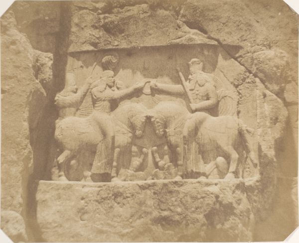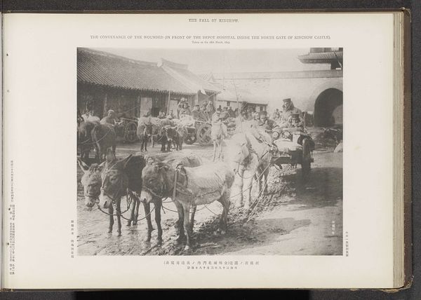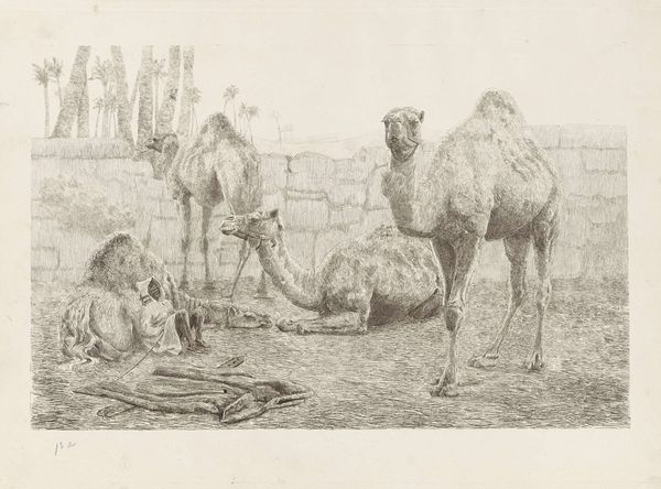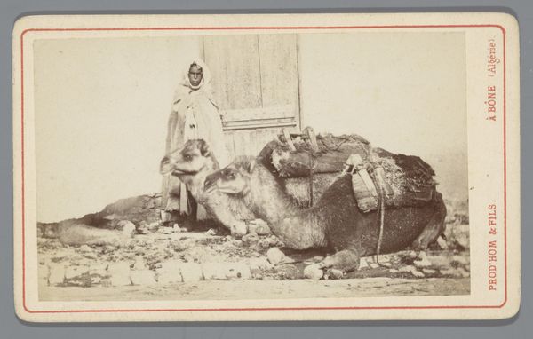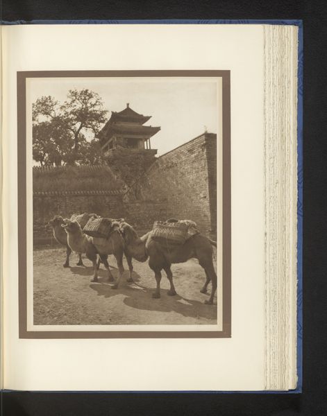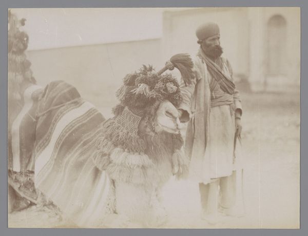 Curator: Before us is "Pekin. No. 923," a photograph captured by Lai Fong in 1867. Editor: There's a stillness here, despite the bustling street implied by the title. The light gives everything a soft, sepia tone. The texture of the camel's fur looks so tactile! Curator: Fong was a pioneering photographer based in Hong Kong. What's significant is that his studio documented a wide range of subjects, from landscapes to portraits. However, he situated much of his work within the visual vocabulary understood by Europeans at the time, but as an Asian man operating under imperialism. Editor: So, it’s important to remember the photograph as not only the creation of a person, but also created within specific social systems? The photograph becomes a form of labor and material for exchange? Curator: Precisely. Let’s consider this scene. The composition, for instance. We see the camel, saddled and ready for transport, likely intended to capture a scene of exotic ‘daily life,’ through a Westernized gaze. This photograph exists as part of an early era of cultural documentation under an uneven system. Editor: Yes, the context really complicates things. It’s interesting how photography, a relatively new technology, became such a potent tool for representation and the shaping of cultural perceptions. I keep thinking of the camel itself, it’s an interesting commodity here, so laden. What would it carry; who would be impacted? It becomes almost anthropomorphic. Curator: I agree, considering the layered narrative embedded into these photographic techniques—Fong allows a certain representation to come to fruition as well, considering the audience for the photography studio and their preferences in documenting what would be 'important' or 'of value' when understanding foreign culture. Editor: Understanding the complex interplay of social exchange is essential when experiencing art of the past. Curator: Yes, and by bringing these intersectional layers of thought into consideration when experiencing this photography and photographs such as it, our understandings become much more rounded.