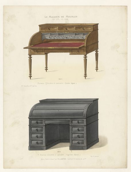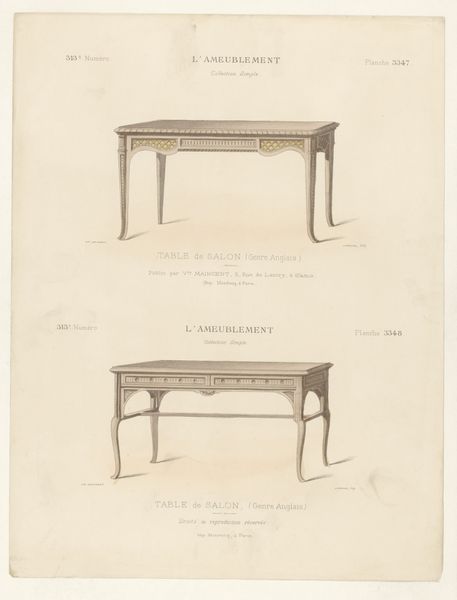 This print by Léon Laroche depicts a design for a sideboard and table. The print likely dates from the late 19th or early 20th century, a period when industrialization was transforming furniture production and consumption. The image is likely part of a catalogue intended to promote particular styles, here of furniture, and was perhaps targeted at middle-class consumers seeking to furnish their homes in an up-to-date manner. The careful detailing and classical references speak to a desire for refinement. However, the efficient depiction of the furniture also suggests an acknowledgement of industrial production. To truly understand this print, one needs to consider the broader economic and social changes taking place at the time and how taste and style served as a way to define social status. By exploring archives of trade publications and exhibition catalogues, we can begin to understand the public role of art in shaping consumer culture. The meaning of this artwork is tied to social and institutional context.