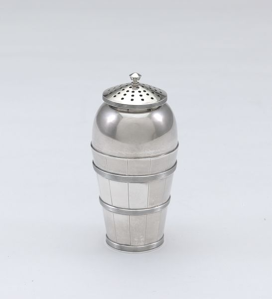 Curator: Looking at this object, I’m immediately struck by its humble yet refined presence. What are your initial impressions? Editor: Austerity, mainly. It feels so devoid of ornament, yet also perfectly resolved. We have here a baroque silver sculpture referred to as 'Strooibus'. Attributed to Wessel Jansen and made sometime between 1642 and 1696. Curator: I’m intrigued by the relative simplicity of form: the cylinder, the hemispherical dome. There are three ball feet raising it just above the surface on which it sits. There's a quiet geometry at play. Editor: This isn’t just any geometric object. Think of the cultural role of spice, once worth more than its weight in gold. The vessel that houses those precious flavors takes on a symbolic power. Spices weren't merely culinary; they held associations with wealth, luxury, trade, and exploration. A container like this "Strooibus" speaks to the status and aspirations of its owner. Curator: The perforations on the dome disrupt that simplicity, and also give this metal thing texture and character. Notice the reflected light, too, captured and fractured by the curves and the silver’s polished surface. Editor: These small holes also served an important role of sprinkling, carefully dispensing these expensive flavours for special meals and celebrations. Its scale suggests intimate gatherings, shared amongst a small, exclusive group. There's a silent echo of banquets and rituals long past. Curator: In isolating basic components—sphere, cylinder, circle, we can analyze the structural integrity as an aesthetic statement. Form and function are inseparable and yet transcend their practical purpose. Editor: Precisely. This is not simply a functional item; it is a signifier of much broader cultural meanings that this "Strooibus" possesses. Its understated presence embodies an era defined by elegance, restrained opulence and privilege. Curator: An object lesson in design. I’ll certainly think about the interplay of form and function when I next reach for the pepper. Editor: And I, how humble vessels often whisper the loudest stories.