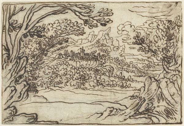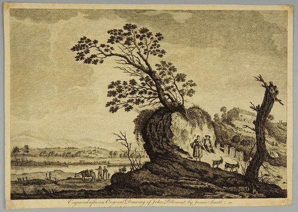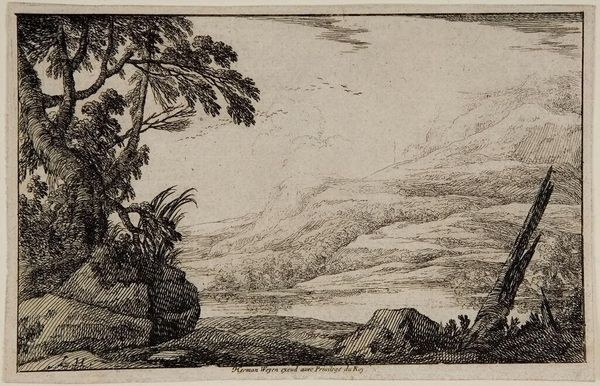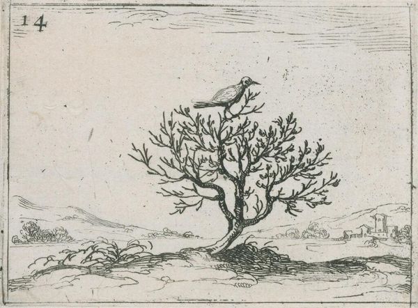 Curator: Jacques Callot's "Bird Flying Over the Desert," a small etching, presents a rather desolate scene. It's housed at the Harvard Art Museums. What strikes you first? Editor: A lonely freedom. It feels vast and empty, yet that bird against the sky...it's hopeful, somehow. Is this a depiction of real world? Curator: Callot was a master printmaker; this is his landscape. The etching's lines, consider their production, they are defining the relationship between human artifice and the natural world, right? Editor: Absolutely. It's like he's searching for something. Or running from it. That stark tree to the left... it's almost a character in itself. Curator: The tree and its situation in the frame suggests this is a landscape of the mind, where the etching needle scratches at the surface, revealing ideas about place and being. Editor: Maybe. Or it's just a pretty bird looking for a drink! Anyway, I'm glad Callot took the time to see and share it with us. Curator: So glad that we can continue to examine and consider such beauty in our own spaces.