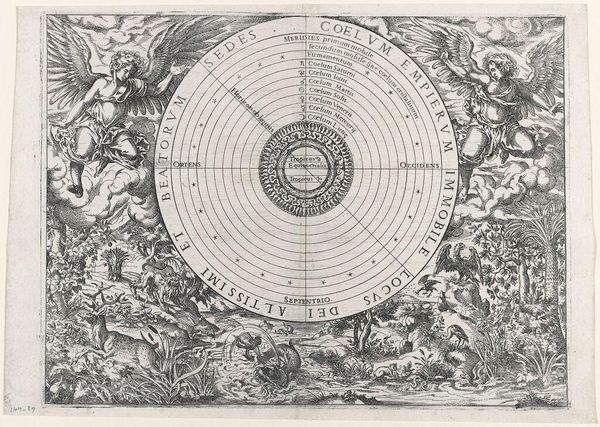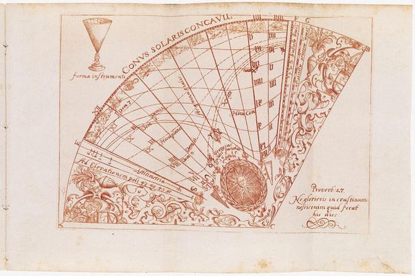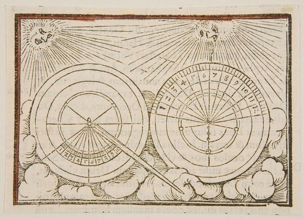 Editor: We are looking at "Schaduw op zonnewijzer teruggezet voor Hizkia," or "Shadow on sundial set back for Hezekiah" by Hans Holbein II, created in 1538. It’s a pen sketch displayed at the Rijksmuseum. I'm immediately drawn to the intricate linework; the piece feels incredibly precise, almost architectural in its detail. What strikes you most about its composition? Curator: I note primarily the dialectical tension created by the bifurcated composition. Holbein sets two distinct, circular forms side by side, each acting as a sundial yet rendered with contrasting internal geometries. This contrasting form invites structural analysis. Do these varying graphical languages speak to separate concepts within the narrative, or perhaps divergent approaches to understanding temporality? Editor: That's a great point about temporality. I was so caught up in the geometry. But are you suggesting that even the stylistic differences between the sundials might be significant? Curator: Precisely. The presence of what appears to be a narrative element, indicated by the inscription and figures of the sun itself, lends itself to the assumption of differing intentionalities within each graphical unit. What semiotic system might best codify the variations in texture and direction in these 'suns' or radiant fields, and what can such differences mean? Editor: It’s fascinating how a seemingly simple sketch reveals such layers of meaning upon closer inspection. I’ll definitely be thinking more about the individual components. Curator: Indeed. Form precedes function. It provides the basis to the rest. This exercise also reaffirms how even seemingly utilitarian forms like a sundial become expressive through considered application.