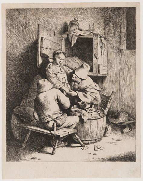 Editor: So, this is "Women Washing" by Charles Jacque, an etching from around the mid-19th century. The composition feels really intimate, like a captured moment in a humble, working-class home. The textures created by the etching are pretty remarkable, aren't they? What stands out to you the most about it? Curator: The focus on the labor of women, particularly domestic work, is key. This etching, a readily reproducible form, brings that reality to a wider audience, contrasting with idealized portrayals of women. Notice the rough-hewn wood of the well and buckets – it’s not just setting, it’s about the tools and material conditions defining these lives. Editor: That’s interesting, because I almost overlooked the buckets and the well itself, focusing on the women's posture. I do see your point. Curator: Think about the labor involved. Gathering water, washing clothes... Jacque uses etching to capture this texture and show us that these weren’t easy, idyllic tasks. It invites us to contemplate the division of labor and the roles women played in sustaining households. How do you think that accessibility – being a print, multiples of which could circulate – affected the art world? Editor: I hadn't considered that so carefully before, focusing on the means of production and consumption really changes how I perceive it. This becomes less about aesthetic skill, and more about… raising awareness? Curator: Precisely. Etching democratizes art, bringing scenes of everyday life to those who might not have access to oil paintings displayed in salons. Jacque's decision to employ this medium suggests an intent to connect with a different audience and showcase previously underrepresented facets of labor and domestic life. Editor: That’s a fantastic way to think about this. It's so much more than just an image of women washing. It's about access, labor, and material reality. I'll never look at an etching the same way again. Curator: Indeed. Looking closely at material, production and accessibility opens us up to different questions and expands our understanding of art's role in society.