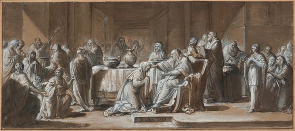 Jean-Baptiste Greuze’s drawing, "The Return of the Young Hunter," presents us with a scene rendered in muted earth tones, primarily browns and creams, achieving a softened, almost dreamlike quality. The figures, arranged in a shallow, frieze-like composition, convey a sense of domestic tranquility punctuated by the excitement of the hunter’s return. Greuze masterfully uses line and shadow to define forms and evoke emotions. The artist’s rendering of fabrics and skin creates subtle contrasts in texture, engaging the viewer through the tactile quality of the drawing. The composition is structured to emphasize the familial reunion, with gestures and gazes directing our attention to the returning hunter. The setting, a classical interior, speaks to the values and aspirations of the Enlightenment era. However, the softened lines and subdued palette perhaps destabilize the period's emphasis on clarity and reason, instead inviting a more sentimental, emotive response. This tension between form and emotional content is quintessential Greuze, marking a moment of transition in art history.