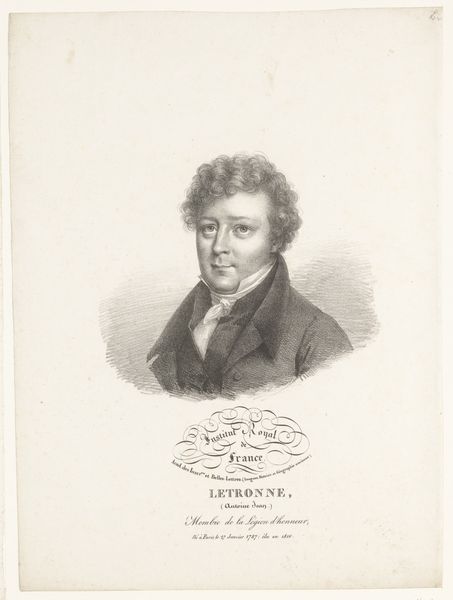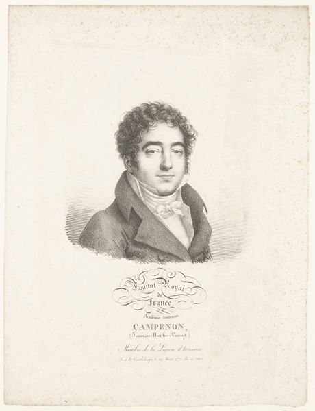 Julien-Léopold Boilly created this lithograph portrait of the sculptor Charles Dupaty using delicate hatching and gradations of tone. The arrangement directs your eyes towards Dupaty's face, framed by his curly hair and coat collar. Boilly's masterful use of lithography captures the texture of Dupaty’s jacket and the soft, diffused light around his figure. The inscriptions below act as semiotic markers, locating Dupaty within the cultural and institutional frameworks of his time. His gaze, though direct, carries a hint of melancholy, enhanced by the softness of the lithographic medium. The controlled tonal range and precise lines create a sense of intimacy, inviting contemplation on the sitter’s character and social standing. The very act of representation here reflects the cultural values placed on artistry and intellectual pursuit during the period.