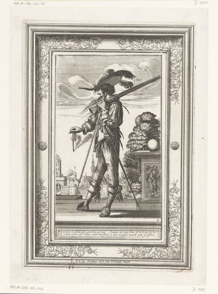 Jan de Bray made this print, Gusman d'Alfarache op podium voor landschap, using the intaglio process, sometime in the 17th century. Intaglio, from the Italian word for "engrave," involves cutting lines into a metal plate, inking the plate, and then using a high-pressure press to transfer the ink to paper. Look closely, and you can see the crisp lines that define the figure and the landscape behind him. These lines aren't just marks; they're the result of labor, skill, and a deep understanding of materials. The process reflects a culture that valued precision and craft. Each line required deliberate action and control, mirroring the social hierarchies that are depicted in the artwork itself. The work involved reflects broader issues of labour, politics, and consumption, all interwoven into the fabric of the artwork. By appreciating the intricate labor involved and the social context of its production, we gain a richer understanding of the artwork's place within the broader history of creative practices.
