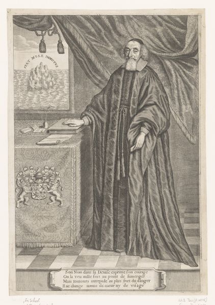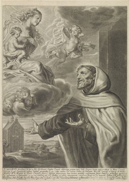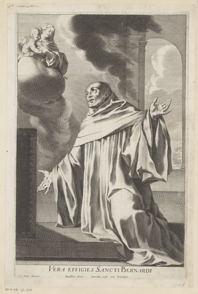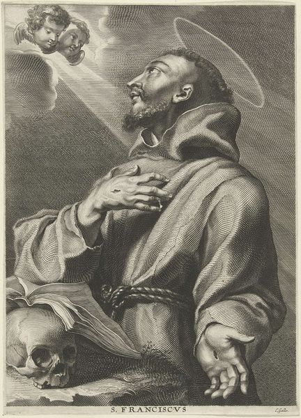 Andreas Matthäus Wolfgang created this print, "Portret van de heilige Johannes van het Kruis" using engraving. The composition immediately draws the eye to the figure of Saint John, bathed in a soft, ethereal light that dramatically contrasts with the darker, more subdued background. Notice how Wolfgang uses line to create a rich texture, particularly in the folds of the saint's habit and the swirling clouds. This engraving technique allows Wolfgang to model form and imbue it with a sense of depth. The semiotic elements here are quite compelling. The dove, a symbol of the Holy Spirit, is depicted as a beam entering Saint John's ear, suggesting divine inspiration. Emerging from the Saint's mouth is a scroll with the inscription "proba me domine," meaning "prove me, Lord," challenging the notion of fixed religious doctrine, suggesting a more personal, direct engagement with divinity. The artist invites us to consider how the visible world interacts with the divine. Wolfgang underscores the complexities of faith and representation, rather than offering simple, didactic imagery.