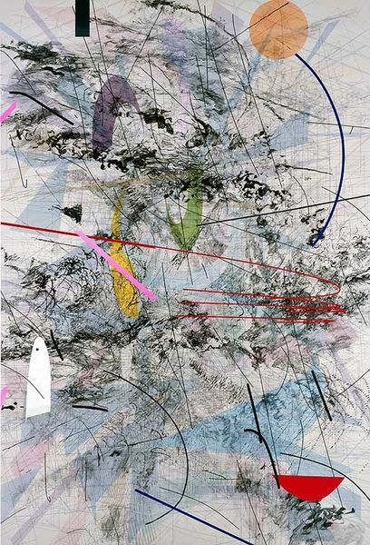 Curator: Jean-Paul Riopelle’s “Jute IV,” created in 1967, employs a compelling mixed-media approach that combines graphite, printmaking, and impasto techniques. Editor: It's a captivating image, yet somewhat unsettling at first glance. The tangled lines and muted grays give it a chaotic feel, like looking into a storm. Curator: Indeed, Riopelle's artistic milieu often navigated between gestural abstraction and the automatism embraced by the Surrealists. Looking at “Jute IV,” one sees that his exploration of abstract form goes beyond mere aesthetics. The work can be viewed as a reflection of its time, mirroring the mid-century tensions of social structures through fragmented lines. Editor: I can see that, and there's a striking rawness that conveys the sense of social fragmentation but also ecological degradation of its era. Those scattered blues and reds punctuate the greyscale palette with almost violent undertones. It is quite evocative for something mostly monochrome. Curator: The layered textures and use of impasto add significant depth. Considering it as a print with graphite, those textures take on a new kind of boldness for a traditionally reproducible medium. It resists standardization, it creates an authentic image for viewers engaging with it now and decades after its creation. Editor: Precisely, it resists easy consumption. And beyond the formal elements, I see echoes of socio-political disruption, perhaps the unease percolating in society reflected through this layering. Its messiness reads as a metaphor for systemic issues – environmental carelessness, political disillusionment, maybe even hints of anti-establishment resistance. Curator: Thinking about how galleries and museums displayed pieces like "Jute IV", we can analyze the social contexts where this type of abstraction gained visibility, indicating evolving societal tastes and ideological acceptance. The lack of specific iconography would make this palatable for audiences that may be adverse to overtly politically themed art. Editor: Thank you. That gives me much to ponder. Curator: Yes, the politics of abstract imagery invites that.