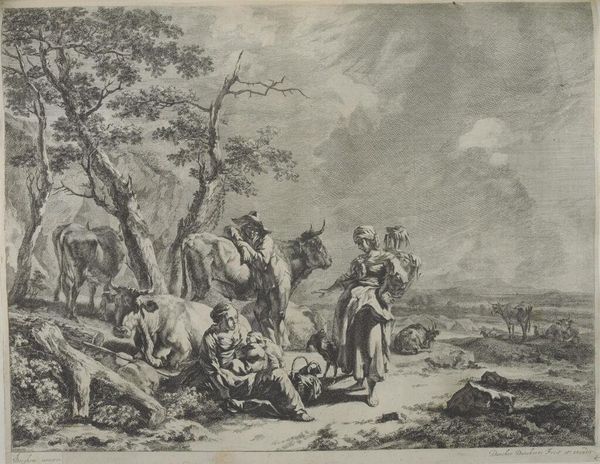 Editor: Here we have "Aaron versmelt de vaten om het gouden kalf te kunnen maken," or "Aaron melting the vessels to make the golden calf", a Baroque ink and engraving piece by Louis de Deyster from around 1666-1711. The sheer detail achieved through engraving is incredible; what’s your take on this work? Curator: What immediately grabs me is the emphasis on process, especially within this religious narrative. Deyster's choice of engraving invites us to consider the labor involved. Look at the melting of those vessels; it is the labor of crafting belief, the transformation of raw materials into an object of worship. What do you notice about the composition? Editor: There’s a distinct separation. Some figures actively work at the furnace, others observe passively in the background. Curator: Exactly! And consider the context: this isn’t just a biblical scene; it’s a commentary on the materiality of faith itself. The gold, acquired through who-knows-what means, is being reshaped to suit a new system of belief, driven by societal pressure. The method and labor is exposed for our viewing, as we also watch. How might this challenge traditional distinctions between ‘high art’ and the practical ‘craft’ of idol-making? Editor: I guess it makes you think about where value really comes from. We’re seeing faith commodified, brought down to earth and reshaped by human hands… Curator: Precisely. The artistic skill isn't just aesthetic; it’s about illustrating the social act of creating a tangible symbol of worship. Deyster challenges us to acknowledge the materiality underpinning even the most abstract concepts of faith. Editor: It’s interesting to see the artist highlighting the manufacture of belief, linking the process to its inherent value. Curator: Indeed, and by meticulously depicting the labor and materials, Deyster prompts a critical reflection on both religious and artistic creation. A definite materialist reading. Editor: That’s really given me a lot to consider - thanks for your insight!