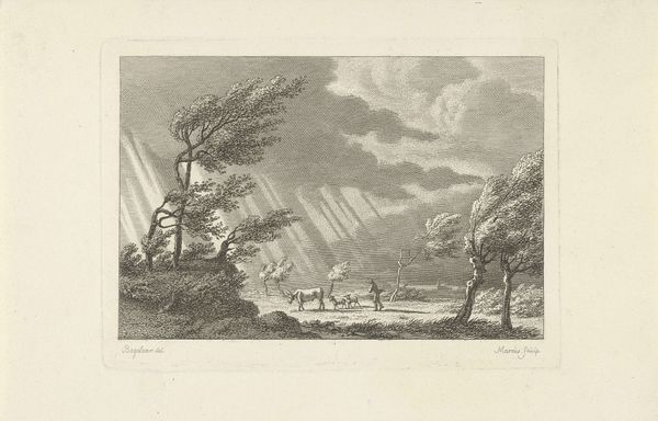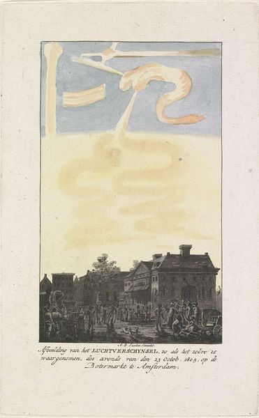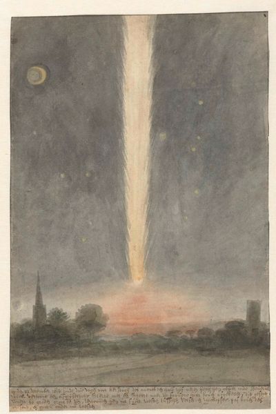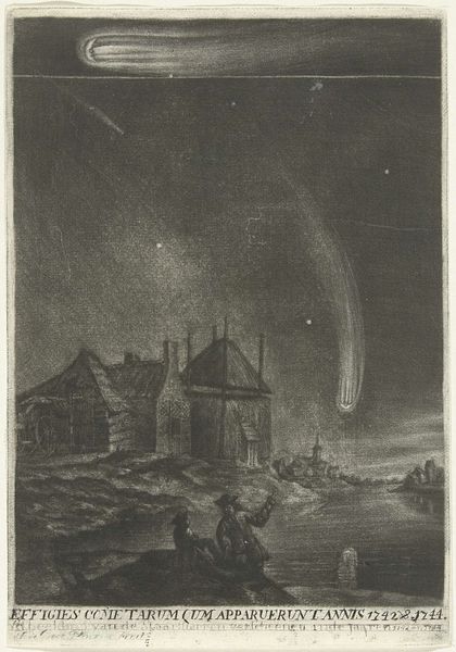 Editor: So, this engraving from 1744 by Johannes de (II) Groot, titled "The Comets of 1742 and 1744," shows a night scene with comets streaking across the sky. There are people looking at the comets, and you can see houses and what looks like a canal too. I'm struck by the contrast between the almost mundane details of the buildings and the extraordinary spectacle above. How do you interpret this work? Curator: Well, immediately, my mind goes to the material conditions that shaped this print. Engraving, as a medium, allowed for relatively wide distribution in the 18th century. This suggests an intention to disseminate information, or perhaps commentary, to a broader public. Consider the labour involved: the meticulous cutting of the plate, the inking, the printing process itself. Do you think the choice of printmaking, specifically engraving, influences how we understand the depiction of these celestial events? Editor: That’s interesting, I hadn't thought of it that way. It definitely makes me think about it not just as a picture of comets, but about the physical making and distribution of knowledge itself. Almost like a scientific diagram or early form of science communication for the masses? Curator: Precisely. The availability of materials, the skills of the engraver, the economic factors enabling the production and circulation of the print – all are critical to understanding its meaning. Was this commissioned, for whom, and why print instead of painting, for instance? Editor: Thinking about it as a commercial enterprise that produced 'art' using particular methods, it raises the question of who its intended consumer was. The materials suggest not the elite necessarily but more a middle class that wanted scientific knowledge or maybe something to display? Curator: Indeed! The print becomes less about pure aesthetics and more about accessibility, knowledge dissemination, and even the social implications of witnessing these celestial events in a particular socio-economic context. We move from contemplating the cosmos to understanding the mechanics of representation. Editor: That completely changed my perception of it. Now, I am seeing this not just as a quaint landscape but as evidence of evolving industrial approaches and how those informed societal dynamics. Thanks so much!
