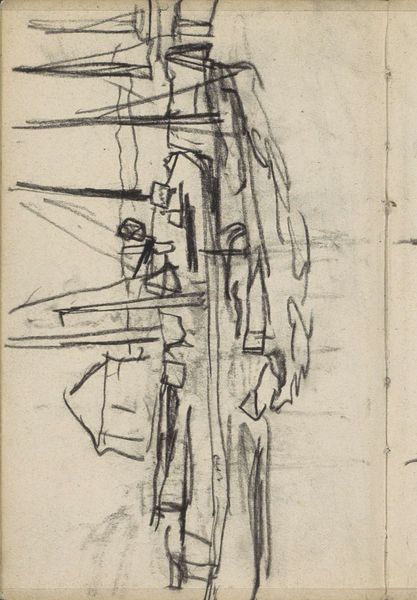 Curator: This drawing, dating roughly from 1886 to 1923, is by George Hendrik Breitner. The work is titled "Brug met figuren op de hoek van het Spui en het Rokin te Amsterdam" - "Bridge with figures on the corner of the Spui and Rokin in Amsterdam". It is currently held at the Rijksmuseum. Editor: There’s a palpable sense of fleeting moments captured here, almost like a quickly scribbled memory. I'm drawn to the anonymity of the figures; they blend into the urban landscape itself. Curator: It’s a wonderful example of Breitner's approach. Note how the lines aren't overly precious, but efficient and direct. You see how he prioritized a readily available and affordable material, pencil, for a rapidly rendered impression? Editor: And I’m struck by the urban environment portrayed. The bridge isn't just a structure; it’s a social space, a site of transit and encounter. What do we know about the socio-economic conditions around the Spui and Rokin during Breitner's time? It feels essential in interpreting this scene. Curator: Certainly. The rapid industrialization of Amsterdam significantly impacted its inhabitants, influencing the kinds of art that were made. Mass production methods and an increasing divide in labor facilitated a market and appetite for these sorts of rapidly executed depictions of modern life, at this time, it becomes divorced from an overtly celebratory purpose, reflecting the complexities of living through rapid urban change. Editor: Thinking about who has historically been excluded from representing these urban spaces interests me. As the art world, even during Breitner’s time, predominantly represented elite perspectives. Curator: That’s astute. I appreciate the perspective you bring about gender, race, class and representation. As an audio guide stop, one goal should be to empower visitors to contemplate these things, particularly given that the majority of individuals living and working at this location, during this time, would have never received recognition. Editor: Exactly. Thanks, this really adds another layer of appreciation for what Breitner captured. I leave now thinking about the untold stories contained within that brief sketch.