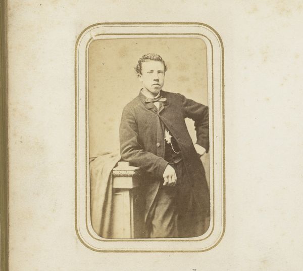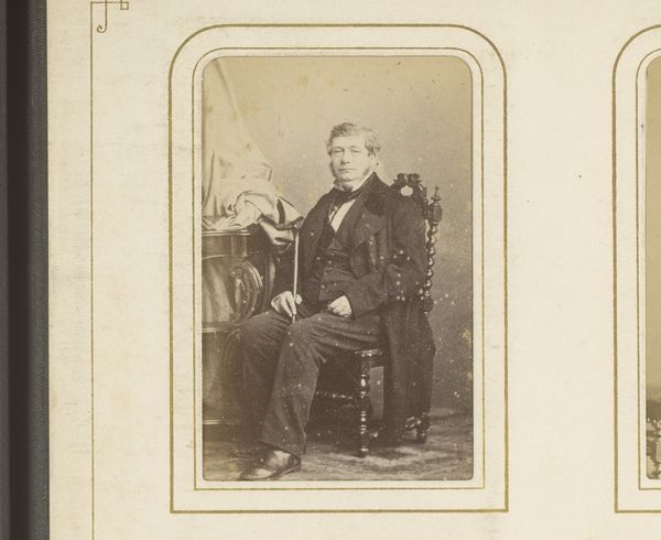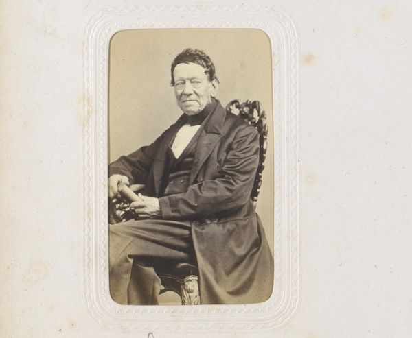 This is a portrait of a seated man by Matthijs Adolph Conen. Its sepia tones create a somber mood, focusing our attention on the subject's form and the textures of his clothing and chair. The composition is structured around a contrast of light and shadow, emphasizing the man's face and the drape of his jacket. The subject's gaze, directed slightly off-center, adds a layer of complexity. His stern expression disrupts any straightforward reading, inviting questions about his state of mind. The photograph’s materiality as a small, handheld object is significant. Photography's emergence as a form of realism offered new ways of seeing and representing the world. This portrait’s intimate scale invites a close, personal engagement, yet it maintains a formal distance through its composition and tone. This tension between intimacy and formality defines much of the photograph’s aesthetic appeal, reminding us that even in the most representational art, the artist's choices shape how we understand the subject.