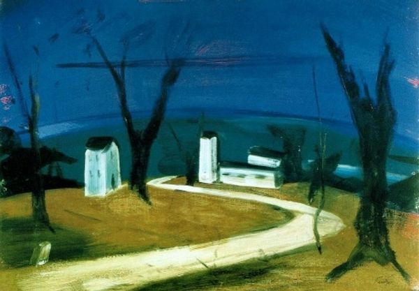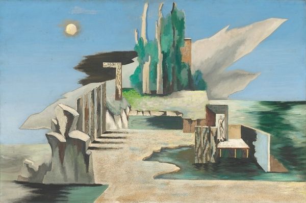 Editor: Right, next up we have Ángel Planells’ “La casa fantasmal,” painted in 1932. It's an oil painting, and immediately I get this… dreamlike feeling. Like peering into someone's very strange memory. What do you make of this piece? Curator: A strange memory is spot on, I think! It feels like rifling through the attic of the subconscious. This painting really encapsulates Planells’ surrealist style—his ability to conjure the uncanny from the mundane. See how he plays with perspective and scale? How the indoor elements mingle so nonchalantly with the beachscape? It is almost unsettling, but not quite. Have you seen his other pieces? Editor: A few, but this one really grabbed me. That ruined building, almost a stage set, with these…random figures placed just so. It’s more dream logic than real life. I am not too sure who are the real figures or not. Curator: Exactly! The lack of clear narrative invites the viewer to fill in the gaps with their own associations. Who *is* that pensive gent in the box? Are they observing, judging, or are they another fragment in a world falling apart? The best kind of art asks more than it answers. I find it hard to place what he is thinking, do you get any feelings towards this gentleman? Editor: I love that! I hadn't considered that narrative angle so overtly. This definitely gives me something new to ponder on my next visit. I am very glad you asked about that man in a box; otherwise, he would go right over my head. Curator: And that's the joy of surrealism! There's no single "right" interpretation, just layers of meaning waiting to be uncovered, with a bit of humor on top. It definitely gives some food for thought!