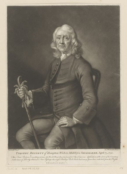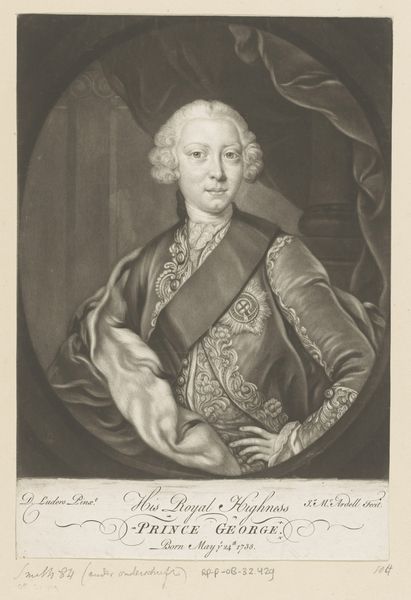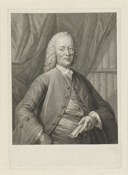 Curator: This engraving, titled "Portret van John Coutts," dates back to between 1751 and 1753. It's by James McArdell and currently resides here at the Rijksmuseum. An intriguing portrait of a prominent figure of his time, I must say. Editor: The immediate feeling is one of measured authority, wouldn't you agree? His gaze is direct, almost penetrating. It gives you the sense of a person used to being listened to. Curator: Indeed. The portrait captures John Coutts, who was the Lord Provost, or Mayor, of Edinburgh. It reflects the increasing importance of civic leadership during the Enlightenment. Portraits like these cemented public perception of power and influence within local governance. Editor: That elaborate wig is a fantastic status symbol too. Not to mention the details in the coat buttons and fabric, each meticulously rendered. The clothing itself serves as an outward signifier of class, education, and good standing within his community. Are there hidden meanings there as well? Curator: It’s interesting to note the history of printmaking in the Netherlands as it democratized images. Engravings allowed portraits to be circulated more widely. McArdell skillfully reproduced Ramsay's original portrait for public consumption. It created a more accessible representation of civic authority. Editor: I'm thinking about the oval frame surrounding the subject. Isn’t that a familiar symbol from ancient Rome? The “imago clipeata,” it references a long line of ancestors—a distinguished past and an ambition for historical posterity. Curator: Absolutely. And look closely at the inscription. It’s not just a name; it's "Late Lord Provost of the City of Edinburgh," a deliberate act of remembering his role, securing his place in civic memory. It underscores how crucial public image was. Editor: I find myself dwelling on the contrast between the crisp details of his face and clothing and the slightly softer quality of the background. The engraver seems to invite us to consider his personal qualities against his civic functions. Curator: Which gets at how a portrait can be viewed as both an individual likeness and an expression of collective identity, serving to uphold or negotiate the dominant cultural narratives. It speaks to how we want to remember. Editor: I think, on second glance, it invites me to look more into the society, to discover the city this person served. Curator: And perhaps that is the role of a good portrait; a doorway into a richer understanding of the individual, his society and its values.