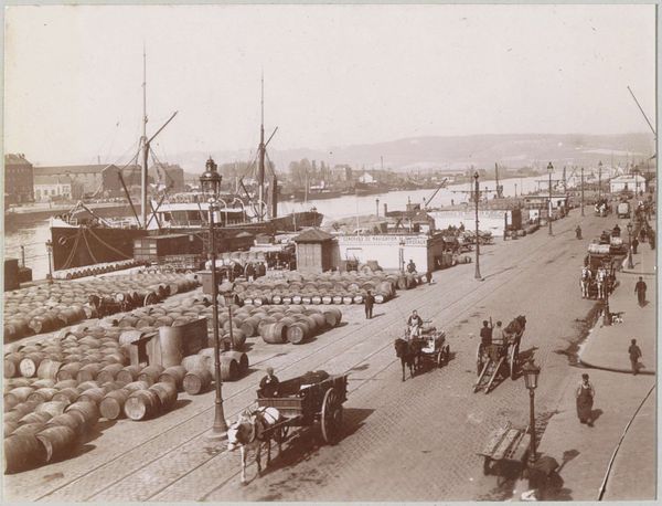 Curator: Welcome. We're looking at Frits Freerks Fontein's gelatin silver print, "Strand met veel publiek", or "Beach with many people", circa 1901. Editor: It has a somewhat muted, overcast feel to it. The composition appears very balanced, almost classical, despite the apparent activity on the beach. Curator: The tonal range, especially in the sky, demonstrates considerable control. Note the composition is very much of its time with the rule of thirds creating emphasis in the distance. Also the high horizon suggests this may have been shot with an early wide angle lens or adapted plate camera Editor: It strikes me how stratified society was here; some ride donkeys for leisure, while others are relegated to laboring on the beach. What does it mean that leisure, particularly at the beach, remains such a visually and economically segregated space? The photograph inadvertently makes an astute comment about labor and privilege. Curator: That’s certainly a reading, but the photograph itself— its internal relationships—are ordered along more strictly pictorial lines. See how the verticality of the buildings at the beach front balance the horizontality of the ocean, the wet sand catching reflections which echo those forms. Editor: But to ignore the social commentary inherent in the captured image seems willfully ignorant, don't you think? To look at the silver gelatin and not to register a rapidly modernizing culture at its apex, for some, at the expense of others? Curator: Perhaps. But one can admire its formal rigor. Even today, after 120 or so years. Editor: Which speaks to the powerful formal qualities and equally important social narrative frozen in time. Curator: Indeed. It is an object lesson. Editor: Certainly.