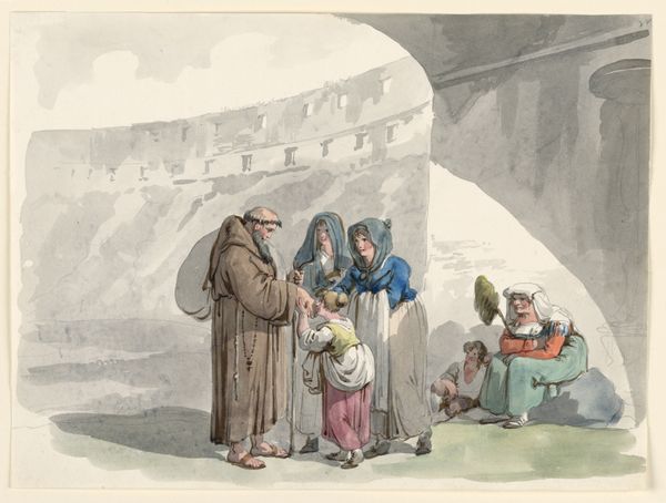 This is Bartolomeo Pinelli's watercolor, "Two Girls from Frascati Visit a Hermit" held at the Cooper Hewitt Museum. The composition is dominated by a stark contrast, with the colorful figures on the left balanced against the muted tones of the hermit's dwelling on the right. The artist masterfully employs a semiotic system that juxtaposes the vibrant attire of the visitors against the somber, earthy hues of the hermit's garb and surroundings. The cool grays of the archway and background contrast with the warmer browns and reds of the figures, creating visual tension that asks us to question fixed categories of gender, class, and place. The texture in the architecture is a series of arches that offer a sense of depth and confinement. Pinelli does not present a singular, didactic narrative but rather uses visual elements to engage with ideas around social and cultural encounters. The formal arrangement invites ongoing interpretation and re-interpretation of its themes.