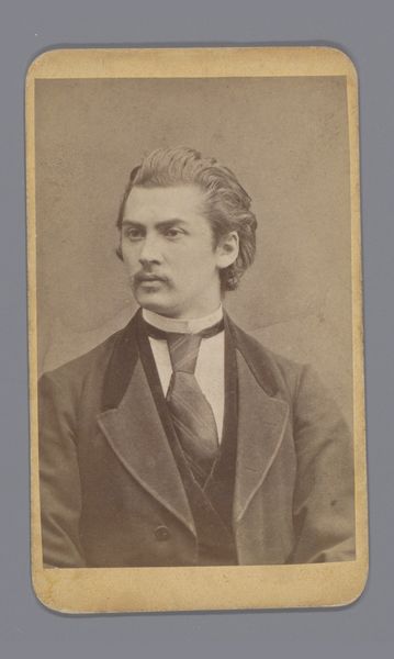 Curator: Here we have a captivating albumen print from the mid-19th century, somewhere between 1861 and 1874, by Albert Greiner. It is called "Portret van een onbekende man", or Portrait of an Unknown Man, from our own collection here at the Rijksmuseum. Editor: It’s striking how immediate the portrait feels, even today. His slightly dishevelled hair and intense gaze almost convey a romantic angst. Do you feel that? Curator: It definitely encapsulates elements of Romanticism in its era. Daguerreotypes and albumen prints were becoming more widespread, offering a burgeoning middle class the chance to emulate aristocratic portraiture traditions. This image democratized representation. Editor: That bow tie – such a strong symbol of burgeoning middle class aspiration and status. A fascinating sartorial signal in a rapidly changing society, don't you think? How meticulously people curated their self-image even in these early photographic endeavors. Curator: Precisely! Photography allowed for controlled, reproducible self-presentation on a mass scale. Greiner was among many studios capitalizing on the desire for memorialization and social promotion. This card photograph, meant for distribution and exchange, speaks to evolving social rituals. Editor: He seems both defiant and vulnerable to me. Look at those eyes... the iconography seems clear to me: this fellow wished to be remembered in the future. His carefully messy hair, a subtle symbol against bourgeois restraint. Curator: Interesting take. Or, was the ‘carefully messy’ look simply what could be accomplished when traveling to Greiner's Amsterdam studio? Maybe the mussed look was merely due to limitations in technology. Editor: It’s true that limitations always influence art... but within those, symbolic intent often finds its way through. Considering the cultural shifts of the 1860s and 70s – scientific advances challenging established norms, alongside artistic experimentation—perhaps this 'unknown man' embodies that tension beautifully. Curator: A compelling thought. What this photograph ultimately gives us, whether accidental or deliberate, is a complex and ultimately unresolvable image of nineteenth-century society. Editor: Exactly! So, even an anonymous portrait reveals silent stories if you pay enough attention.