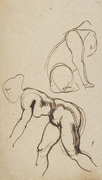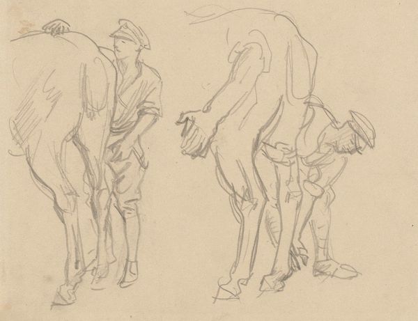 Editor: This is John Singer Sargent's "Studies for 'Shoeing Calvary Horses at the Front'," created in 1918 with pencil. It's quite stark and sketchy, almost fragmented, depicting figures and horses in varying degrees of completion. What draws my eye is the contrast between the delicate lines and the very rough subject of war. How do you interpret this work? Curator: Immediately, I observe the composition. The arrangement of forms across the page is asymmetrical, yet balanced. The repeated motif of the horse and human figures generates a visual rhythm. Note Sargent's handling of line— it is not descriptive, but rather, evocative, using hatching and contour to suggest form and volume without adhering to strict realism. Consider, for instance, the tension he creates simply through line weight. Editor: Yes, I can see that now. I notice some of the forms are barely suggested, just outlines. And yet, they convey movement and weight so effectively. Why do you think he chose to leave the forms so open and incomplete? Curator: Precisely. That openness is critical. Rather than providing a finished picture, the study invites the viewer to participate in the act of seeing and constructing the image. It prioritizes the process of visual thinking. Furthermore, the apparent lack of finish could itself be a comment on the fractured nature of war, never giving the viewer a sense of resolution. Editor: That's a perspective I hadn't considered. It’s interesting how much the *lack* of detail can add to the overall meaning. Curator: Indeed. Art's strength is in the careful curation of the artistic choices. It seems this sketch relies entirely on semiotics in the suggestion of motion to allow a closer introspection by the viewer. Editor: I've definitely learned to look beyond just what is there to understand the choices behind what is omitted. Thanks!