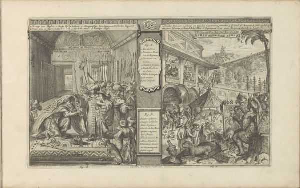 Editor: Here we have "Roomse feestmaal, 1705," created sometime between 1689 and 1707, of which the author is unknown, housed at the Rijksmuseum. This baroque engraving shows what looks to be a very chaotic and rowdy scene. It's quite detailed, with a lot of figures and symbols. What are your thoughts when looking at this engraving? Curator: Let us first consider the arrangement. The artist establishes a clear foreground, middle ground, and background, creating depth within the relatively shallow space. Consider the use of line. Note how the varying thicknesses and densities of the lines define the forms and create areas of shadow and light. The composition leads your eye from the lower left inscription upward, inviting you to follow the gestures and gazes of the figures. What is the effect of this rising movement? Editor: It feels almost theatrical, like a stage performance where everything is exaggerated. What do you make of the table as a point of convergence in the image? Curator: Indeed. Observe how the table laden with food functions as a compositional anchor, drawing our focus to the center of the drama. Now, how does the distribution of dark and light contribute to the narrative? Where do you see the strongest contrasts, and how do they affect your reading of the scene? The contrast around the figure in the center certainly suggests they have significance. Editor: The darker areas seem to emphasize the debauchery. It’s also interesting how some figures are very active while others seem to be collapsing, contrasting within the same artwork. I hadn't thought so much about the use of light and dark to suggest the importance of certain parts of the composition. Curator: Precisely. Reflecting on the formal qualities such as line, light, and composition, we begin to understand how the artist conveyed narrative. Editor: Thanks, it really helps to analyze art with an eye to formal components rather than relying just on themes.