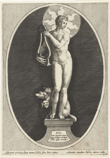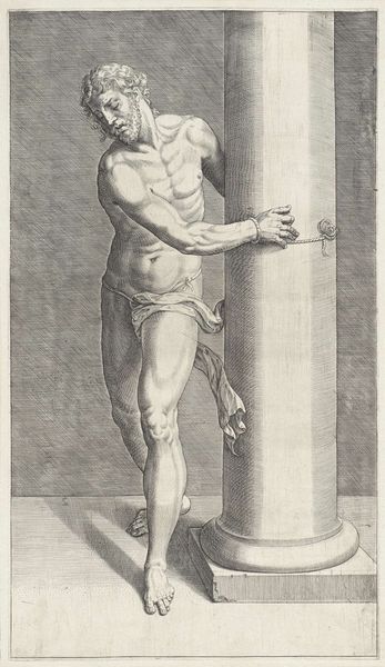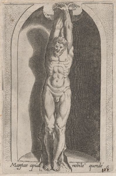 Curator: Take a moment with this engraving, titled "Mars," made after 1585, currently residing here at the Rijksmuseum. Jan Collaert the Younger created this print, after a design by Jan van der Straet, also known as Stradanus. Editor: It’s startling. The figure’s muscularity is so emphasized, especially for a print. What about the artist's intention can you tell me, in terms of the image making, how would you say its effect functions within our view? Curator: Indeed. As a Mannerist work, Collaert highlights an idealized and exaggerated human form, typical of the period. Mythological figures provided artists with license to explore idealized, often nude forms. Here, we see Mars elevated – literally – as the embodiment of war. The print itself becomes a tool for disseminating power. It speaks to cultural ideals prevalent during the late 16th century and a desire for a return to Classicism, reshaped and reinterpreted through a decidedly European lens. Editor: Right, the means of production are crucial. It's an engraving, painstakingly etched on a copper plate. This level of detail necessitates time, skill, and artisanal knowledge, it contrasts the brute force of Mars depicted with delicate material production of the piece. This tension is compelling! Curator: Yes, and engravings, like this one, played an essential role in disseminating artistic ideas, wasn’t simply about creating a single image, it's about reproducing and sharing visual concepts widely through printmaking technology of the period. Think of it as early forms of digital content. Editor: Absolutely. I am left pondering the social and political mechanisms governing production, patronage and workshops that defined not only an individual practice but material conditions that enable making and consuming an image such as this in early modern Europe. Curator: It shows how the power of art resides as much in its dissemination and socio-political value as in its immediate aesthetic impact. It really forces you to reflect upon the meaning of imagery, especially with the use of Greco-Roman imagery being so heavily promoted by certain royal houses to strengthen legitimacy and perception of control. Editor: Precisely, the availability of raw materials for both printing, tools involved to do so along with a clear desire shows complex human agency in operation here. Curator: Definitely. Let's move on.