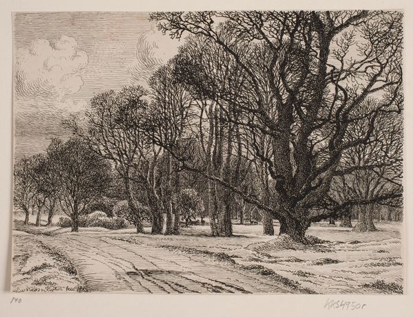 Editor: This is Peter Halm’s "Biebrich, Chestnut Tree Allée," a print, and I find the composition quite striking, almost theatrical in its presentation of nature. What do you see in this piece in terms of its historical or cultural context? Curator: Halm’s choice to depict an allée isn't accidental. Formally arranged gardens and tree-lined avenues like this one were often symbols of power and control, reflecting humanity's imposed order on the natural world. Do you see that reflected here? Editor: Yes, it is there in the careful, almost perspectival arrangement. So, Halm's image subtly comments on how landscapes are shaped by human intent? Curator: Precisely. It invites us to consider how seemingly natural settings are often imbued with social and political meanings. It is an interesting insight, don't you agree? Editor: Absolutely, it gives me a lot to think about in terms of the politics of landscape representation. Curator: And I am reminded of the artist's keen ability to reflect socio-political meaning through landscape.