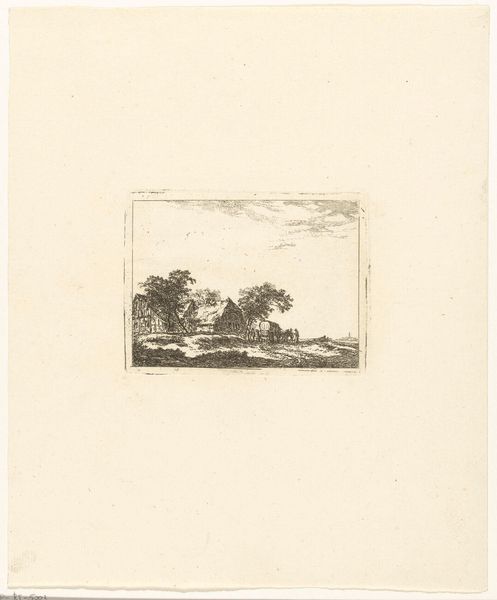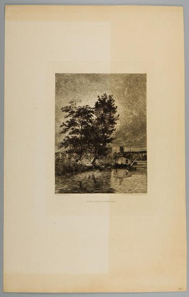 Curator: Let’s examine "The Borders of the Seine" by Alfred Louis Brunet-Debaines. The etcher’s delicate lines capture a pensive scene. Editor: It's so still. Like a charcoal drawing capturing a moment before the world wakes up. Curator: Observe how the artist uses light and shadow to structure the composition, creating depth and a sense of receding space. The trees on the left provide a clear vertical rhythm. Editor: Right! And that single figure in the boat, practically swallowed by the landscape, adds this melancholy note. It’s the kind of image that makes you want to pause and breathe. Curator: Absolutely, the interplay of textures, from the dense foliage to the shimmering water, demonstrates a mastery of etching techniques. Editor: You're right, it's a very subtle sort of mastery. It’s about feeling more than seeing, I guess. Curator: Precisely, and that perhaps is its strength. Editor: Thanks for walking me through that!