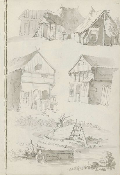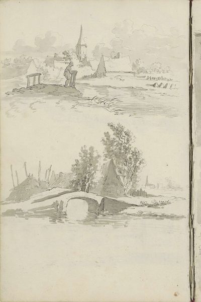 Barend Hendrik Thier created "Omheind weiland en een stadsgezicht", a drawing with an enclosed meadow and cityscape, during a period of significant social and economic change in the Netherlands. The images, rendered in muted tones, evoke the agrarian roots of Dutch society juxtaposed against emerging urban landscapes. The fenced meadow suggests themes of ownership, control, and the division of land which was directly linked to social status. Below, the cityscape hints at the shifting demographics and economic opportunities that were beginning to redefine Dutch identity. Thier, working in the late 18th and early 19th centuries, witnessed the Dutch Republic's decline and subsequent transformation. He presents a subtle commentary on the tensions between rural tradition and urban progress. His work makes us consider the values and power structures inherent in these landscapes. He creates a quiet, reflective space for considering the profound impacts of societal shifts on individual lives and collective memory.