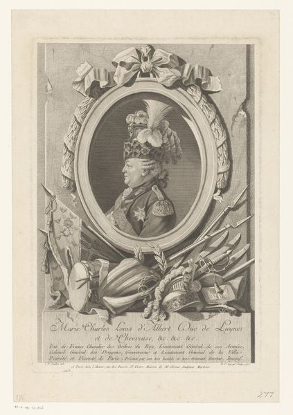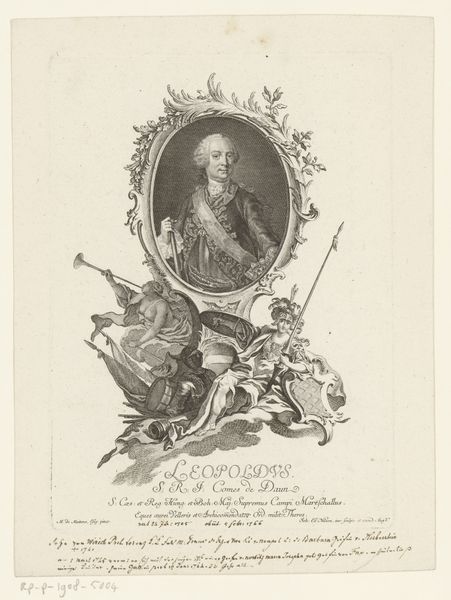 Editor: This engraving, "Portret Frederik Willem II, koning van Pruisen," by Johann Esaias Nilson, dates somewhere between 1731 and 1788. There's such formality in the central portrait, surrounded by these playful allegorical figures. How do you interpret this work? Curator: It's a fascinating clash of symbolism isn't it? The stern, formal portrait of Frederick William II clashes sharply with the playful, almost riotous scene below. Nilson’s decision to portray the King elevated yet seemingly aloof raises some intriguing questions about power. The chaotic gathering of cherubs contrasts the orderly rule of the kingdom, hinting at potential tensions between the ruler and the world he governs. Do you perceive any challenges to his authority embedded within the composition itself? Editor: It’s as if those cherubs are undermining the king’s authority! All the cherubs appear as if their instruments are discarded at random. Curator: Exactly. It's not a celebration of him, is it? Nilson perhaps uses that contrast to encourage viewers to critically examine the values, norms, and contradictions of 18th century Prussian society and politics, by placing Frederick within a wider framework of social commentary, touching upon identity and possibly even gender dynamics in the context of monarchy. Editor: So, this seemingly straightforward portrait is actually a commentary on the king and the sociopolitical atmosphere of the time? Curator: Precisely. The art exists in constant conversation with societal discourse and can become a very effective activist method for interrogating history. Editor: I hadn't considered that. It really changes how I see it. Curator: Hopefully the artwork provides a framework that not only analyzes, critiques, and resists power, but imagines new, radically different social and political arrangements. Editor: That's a very different view than I had when I walked up to it! Thank you for providing some really illuminating points to consider when experiencing and viewing art!