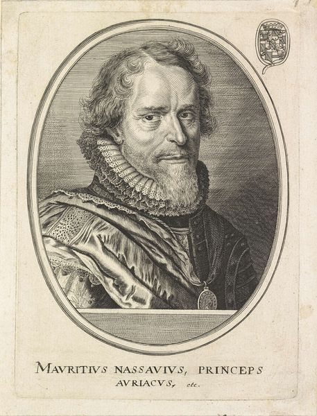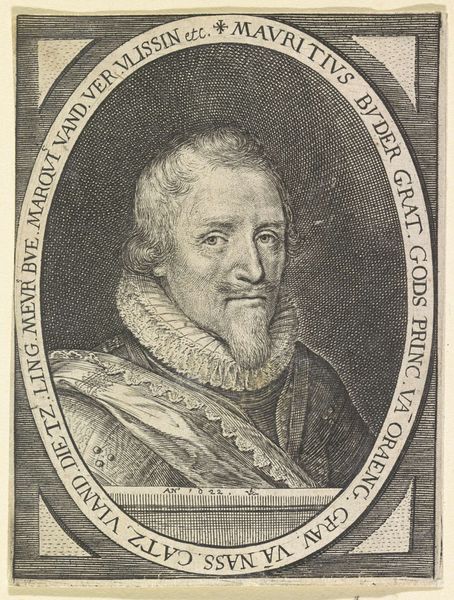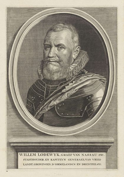 Editor: Here we have a print entitled "Portret van Willem Lodewijk, graaf van Nassau-Dillenburg" by Jan Punt, dating from around 1731 to 1779. It's an engraving and seems very detailed; almost photographic. I find the subject's gaze particularly intense. What catches your eye when you look at this portrait? Curator: Initially, I'm drawn to the structural clarity Punt achieves within the oval format. Observe how the subject's rigid collar and armor create strong horizontal lines that bisect and ground the fluidity of the face and beard. It establishes a compelling tension between dynamism and stasis. Editor: That's a good point. I was focusing so much on the face that I almost missed how his armour and the frame contain it all. Does the symmetry enhance the visual appeal, or is it disrupted somehow? Curator: Disrupted subtly, and I'd argue, purposefully. Note the slightly off-center positioning of the face within the oval. It prevents perfect symmetry, creating a visual "itch," if you will, preventing the image from becoming static or overly formal. Further, let’s observe the contrasting textures - smooth skin, bristly beard, patterned armor. Consider the engraving technique itself, the conscious arrangement of lines that construct these varying tactile sensations. Editor: It’s almost like Punt is inviting the viewer to physically explore the surface. Curator: Precisely. Now consider how that base further defines the portrait. The eye reads the textural shifts as markers. Each strategic compositional choice generates a certain degree of psychological weight within the two-dimensional plane. The subject is a pillar for these different areas. Editor: That's fascinating! I was looking at the face and missing the overall visual design. Curator: Understanding art involves decoding layers, moving beyond mere representation to an appreciation of the formal architecture supporting it. We must understand the building blocks, such as balance and asymmetry, texture and tension. Editor: Thanks for that deep dive, it gives me a greater understanding of printmaking and art overall!