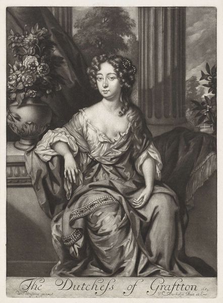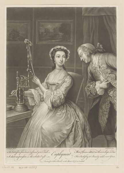 Pieter van Bleeck's portrait presents the actress Catherine Clive in the role of Phillida, showcasing a study in contrasts through careful engraving. The composition draws you into a dramatic moment underscored by texture and form. Notice how van Bleeck employs a stark contrast between light and shadow to define each figure, carving out their presence against a backdrop of ambiguous wilderness. The soft, flowing fabric of Phillida's dress, meticulously rendered, opposes the rough, textured garments of her companion, highlighting a division in their states. Her posture, marked by a delicate hand gesture and averted gaze, suggests a narrative of reluctant engagement. The male figure’s shadow looming over her further destabilizes fixed meanings. Van Bleeck’s approach challenges us to consider not just the characters but also the broader interplay between the artwork's structured forms and dynamic content. It leaves room for interpretation, making it a compelling example of art’s capacity for ongoing dialogue.
