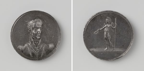 This bronze medal was made by David van der Kellen, likely in 1831, in response to the Belgian Revolution, a pivotal moment in Dutch history. The uprising challenged the established order and the unified Kingdom of the Netherlands. The medal depicts King Willem I, head in profile, embodying power and authority. On the other side, a figure stands next to an altar, symbolizing the collective effort to arm the Netherlands. This imagery underscores themes of national identity and defense during a period of conflict. It’s a very masculine image. This artwork serves as a historical artifact and offers insights into the complex dynamics of nationhood, power, and identity during the 19th century. It's a stark reminder of the human cost of political upheaval and the enduring quest for self-determination.