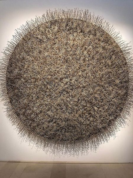This handwoven high pile rug, maker unknown, is a small, tactile world of fiber. The palette is earthy, a comforting blend of creams and browns, punctuated with touches of golden yellow, a bit like a woolly pointillist painting. The texture is the star here. Dense, tufted loops create a topography that invites touch. You can almost feel the give and spring of the fibers beneath your fingers. Notice how the maker uses the different colors of yarn to build up texture, creating soft, organic shapes that seem to emerge from the pile. That dark patch in the center, it's like a little vortex, pulling you into the rug's embrace, a reminder of the way a simple, repeated gesture can create something complex and deeply satisfying. The rug reminds me of the work of Sheila Hicks, who also explored the possibilities of fiber as sculpture, embracing its tactile and textural qualities. It’s a testament to the power of process and the beauty of the handmade.
