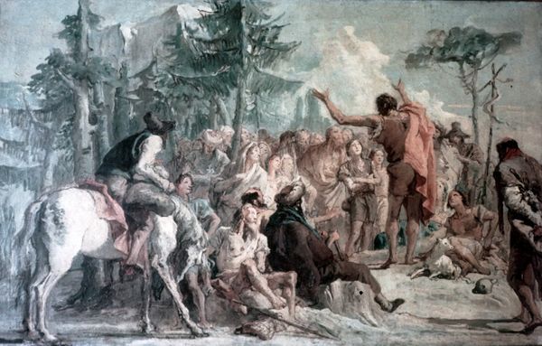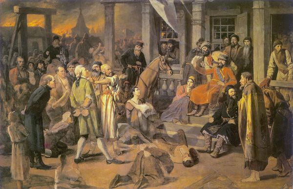 Curator: This compelling oil on canvas is Francesco Hayez’s *The Sicilian Vespers (Version III)*, painted in 1846 and now held at the Galleria Nazionale d'Arte Moderna e Contemporanea in Rome. The artist uses precise brushwork to evoke both drama and emotional tension within the scene. Editor: My first impression is that the scene seems paused, suspended between action and consequence. The somber color palette—greys, reds, muted earth tones—adds to a sense of foreboding, as if something terrible has either just happened or is about to. It’s almost theatrical, really. Curator: Hayez masterfully stages the composition by emphasizing line and form. Notice how the central figure—poised with the sword—forms a clear diagonal, slicing through the crowd, dividing it almost geometrically. And consider how his color choice creates focal points across the plane. Editor: I see it also as a reflection on collective anger, sparked by centuries of foreign domination. *The Sicilian Vespers* were, of course, the uprising in 1282 against Charles I of Anjou’s rule. What this work does effectively, though, is channel that political unrest through individuals—look at the gestures and expressions. There’s a range from grief to fury in that gathering of people. Curator: Agreed. The emotive range presented does provide an important aesthetic and organizational structure in the frame. If we look closely, the artist uses color, texture, and especially light to suggest ways of creating a complex sense of perspective within the setting and staging. Editor: And perhaps this particular framing says much about Hayez’s own moment. Risorgimento Italy looked to history as a way to inspire its future. In a way, then, it's less about medieval Sicily than it is about mid-19th century national awakening. It asks us to see the contemporary resonances. Curator: I’m drawn to the artist’s delicate modulation in shading, but for all our political context and aesthetic analysis, I appreciate most that the power of Hayez's image lies in the strength of its rendering. Editor: Yes, regardless of its historical anchoring, its emotional core keeps resonating powerfully even now.