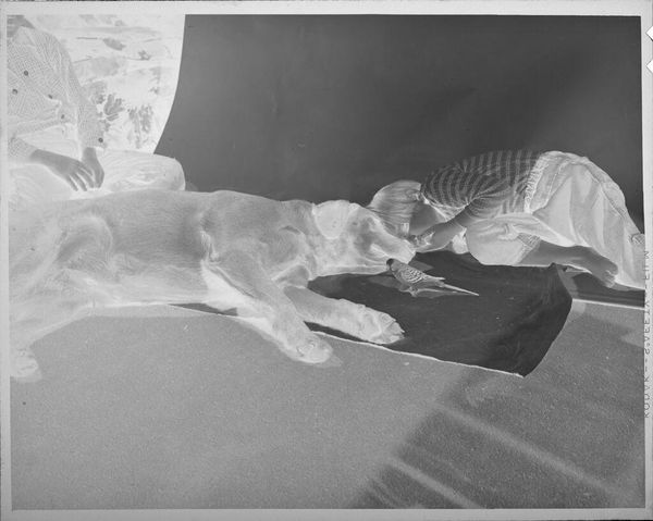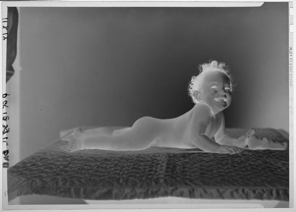 Editor: Here we have an untitled work by Lucian and Mary Brown, depicting a baby on a towel. The black and white tones give it an otherworldly feel, almost like a dream. What do you see in this piece? Curator: Well, first, the inverted tones are quite striking, transforming the familiar into something surreal. It's as if we're peering into a hidden realm of infancy. The baby’s gaze feels both innocent and knowing, doesn't it? It's a potent image that sparks my imagination. Editor: I agree, it really messes with your perception. Thanks, I’ll be thinking about that baby’s gaze all day. Curator: Me too! This artwork is more than just an image; it's an experience!