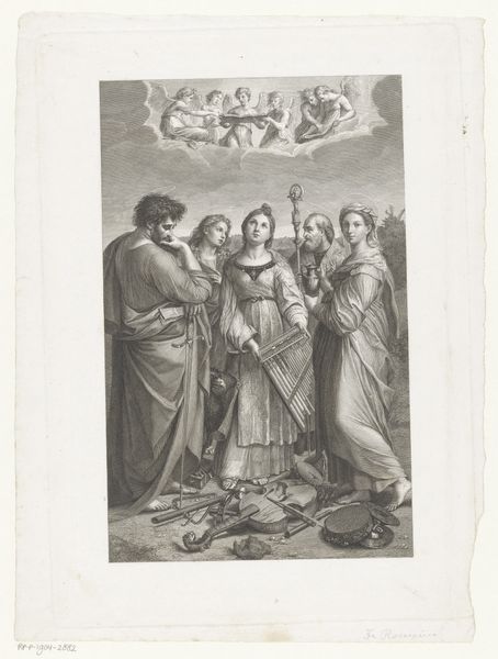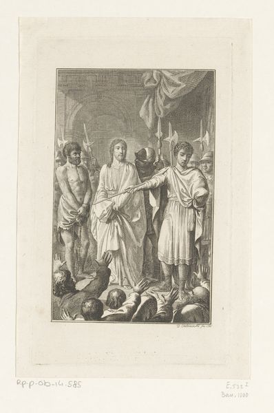 Editor: Here we have Daniel Chodowiecki’s "Merope roept het volk en de priesters op tot een eerlijk proces voor Aegisth", an engraving from 1787. The detail achieved through line alone is remarkable! I'm also intrigued by the implied narrative. How do you interpret this work? Curator: From a materialist perspective, it's vital to understand that printmaking in the 18th century was intrinsically linked to the circulation of ideas and social commentary. Chodowiecki, through this engraving, participates in the broader Enlightenment discourse about justice, governance, and the role of the public. Notice the stark lines, almost mass-produced, highlighting accessibility for wider distribution and engagement. Editor: That's a great point about accessibility. So, it's less about the artistic genius of Chodowiecki and more about the function of the print within society? Curator: Precisely! We consider not only the final product but also the labor involved in its creation: the engraver's skill, the publisher's intent, and, most importantly, the consumption by its audience. How would you consider the act of "reading" or interpreting this print to be a form of consumption in its own right? Editor: I suppose it transforms information into a sort of…intellectual property for the viewer? Curator: Indeed. Consider then, how the artist's choices of subject, composition, and line weight affect not just its aesthetic appeal but also how people perceive, understand, and perhaps even challenge established social structures. This engraving is more than an image, it's a materialized argument! Editor: That reframes the whole image. Thinking about it as part of the larger publishing and distribution industry highlights how the artist contributed to broader public conversations, making history more relatable. Thanks!