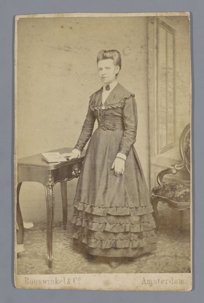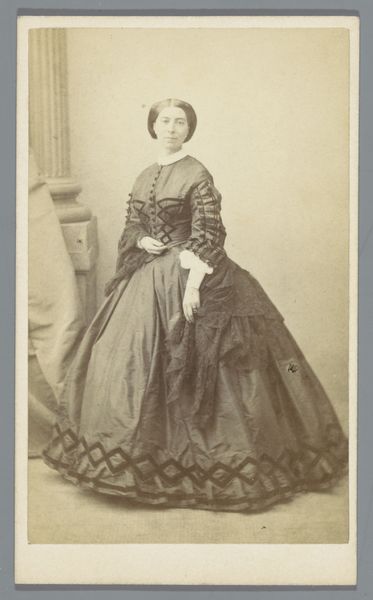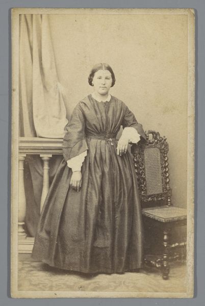 Editor: We’re looking at a gelatin silver print by Dagron et Cie., titled "Portrait of an Unknown Woman, Standing Beside a Chair," created sometime between 1865 and 1870. The image possesses a striking stillness, doesn’t it? The composition, with the subject leaning slightly, and the limited tonal range creates a sense of formality, maybe even melancholy. What visual elements strike you as most significant? Curator: The compositional structure certainly dictates the tone. Consider the geometric rigor in the woman’s dress—the cascading buttons, the symmetry of the skirt's drape—they create a visual echo with the fluted lines of the chair. Note, too, how the limited grayscale amplifies texture; observe how our eye reads from matte fabric to glossier surfaces. How does the stark frontality influence our perception? Editor: The direct gaze definitely commands attention. I'm interested in the repetition of shapes—circles and ovals. I notice them in the buttons of the dress and also on the decorative accessories hanging on the waist, softening what might otherwise feel severe. How does that tension function formally? Curator: Indeed, the strategic deployment of softened forms disrupts any potential rigidity. The eye is coaxed through gentle undulations, from her elaborate coiffure to the tassels dangling near the chair. Further still, examine the drape of the curtain—notice how its arc repeats the curves throughout. This is not merely an arrangement; it’s a meticulously structured dialogue of forms. Editor: It’s fascinating how those echoes bind the subject to her setting, but never eclipse her presence. I can see that! It shows a commitment to details in composition that create something unique out of something that at first appears very simple. Thank you. Curator: Precisely. This study provides valuable understanding into structured art.