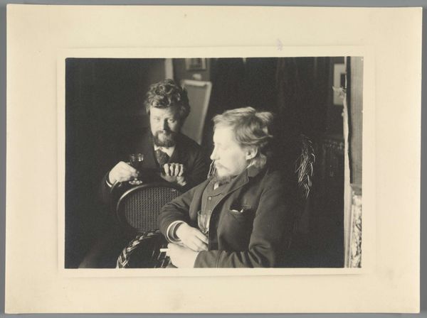 This photographic reproduction of a painting, drawing or print, possibly from the late 19th or early 20th century, captures two men in what appears to be a moment of leisure, both holding wine glasses. The image reflects a self-conscious aestheticism, a common theme in European art of the time. The men, likely members of the cultural elite, are portrayed in a manner that emphasizes intellectual sophistication and refined taste. This photo offers a glimpse into the social circles where art was not just appreciated, but actively shaped. It hints at the role of patronage, and how artists relied on these networks for support and validation. To fully understand this image, we can research period photography and portraiture conventions. In doing so we can uncover how the artwork is situated within the economic structures of its time. We may learn more about the cultural values and assumptions that shaped the production and reception of art. This illuminates art's role as a reflection of, and a participant in, its own social context.