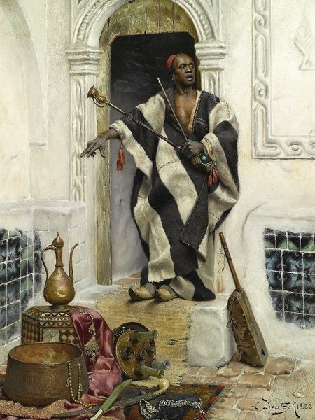 Here, we see "Guarding the Palace," an oil on panel, meticulously crafted by Ludwig Deutsch. The painting commands attention through its rigorous architectural structure, sharply defined geometry, and the striking contrast between the ornate, richly patterned surfaces and the stoic figure of the guard. The artist creates a calculated framework for the viewer's gaze, manipulating light and shadow to deepen the interplay between depth and surface. Consider how the composition itself seems to hold meaning, turning the guard into a cultural signifier, representative of an entire world viewed through the Western gaze. The guard's firm stance and imposing presence suggest power and authority. However, it is also frozen and made immobile. The painting destabilizes established meanings, prompting us to question the values and categories through which we view and interpret other cultures. The very act of representation becomes a subject of analysis, underscoring the artist's role in shaping our understanding and interpretation.