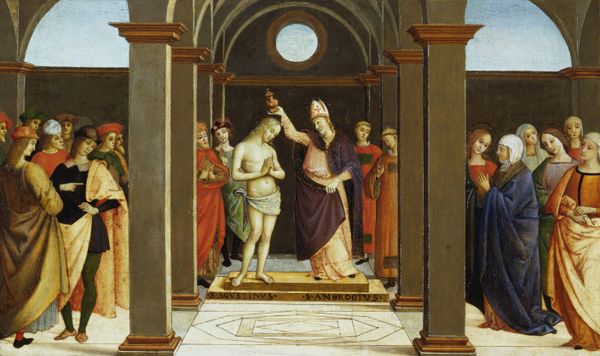These three scenes of the Life of Saint Augustine are painted in tempera on wood by an anonymous artist. They depict Augustine's baptism, his investiture as a bishop, and Augustine as a bishop with members of his order. Painted in Italy sometime in the 15th century, the settings are contemporary to the artist and likely to the original audience. Note the repetition of rounded arches, fluted columns, and classical robes; these visual codes reflected the humanist values of Renaissance Italy, where classical antiquity was seen as a model for art, architecture, and civic life. In particular, the composition, with many figures crowded into a shallow space, is typical of Florentine painting. These scenes demonstrate the social structures of the period, where religion was an important part of civic life and a public spectacle. To better understand the social and institutional contexts that shaped this artwork, one could consult historical documents, religious texts, and studies of Renaissance art and culture.