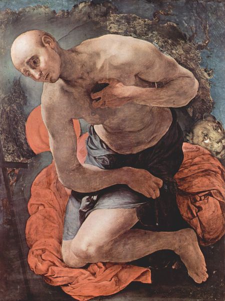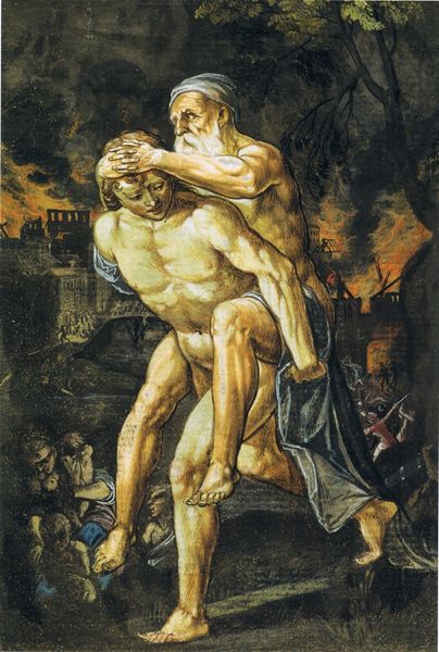 Curator: This oil painting from 1531 is "Hercules and Antaeus," by Hans Baldung. Editor: Gosh, the tension just jumps right out, doesn't it? It’s like they're caught mid-wrestle in a shadowy nightmare. That pale figure screaming—I can practically feel the desperation. Curator: Absolutely. Baldung has captured a pivotal moment from Greek mythology, when Hercules battled Antaeus. Notice the stark contrast in their flesh tones and musculature? Editor: The cool pallor of Antaeus against the ruddy strength of Hercules... It emphasizes the life draining from Antaeus. And the light! It’s all concentrated on their bodies, amplifying the struggle. I guess this speaks volumes on a metaphorical level about grounding versus un-grounding something or someone? Curator: Precisely! Antaeus, as the son of Gaia, gained strength from the earth. Hercules, realizing this, lifts him into the air to deprive him of his power. The composition is so smart. How Hercules dominates this canvas, you get a full-length close-up on their struggle. Baldung uses a rich and deep color in the background and then light washes across their very intertwined limbs. Editor: You know, what really hits me is the raw humanity Baldung injects into these mythical figures. Their expressions—pure anguish and determination. It reminds me that even legends grapple with universal emotions, they may be stronger than us but they still feel all that human rage. Curator: Indeed. Baldung's Northern Renaissance style, combined with the dramatic narrative, offers a compelling take on classical mythology. It shows in the sinuous lines and anatomical exaggerations, that's for sure. Editor: It also hints at deeper questions... the role of dependence, of power... It's pretty unsettling, the scene playing out as this rather violent choreography, and also really fascinating. I'd love to stare at it all day. Curator: Right? Baldung does such a fantastic job here, rendering it as something so forceful and immediate, but you could come and look at it a million times and see more things. It remains unforgettable. Editor: Exactly. Every visit offers new perspectives. Art does that to me, always leaving me in its powerful wake to reflect and transform.