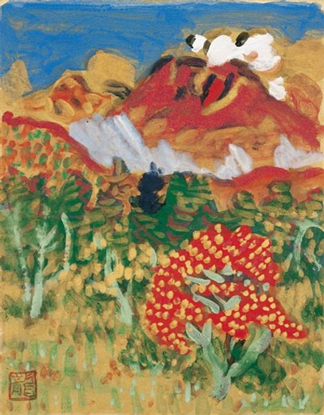 Konrad Lueg made this dreamlike landscape, Alpenlandschaft, sometime in the 20th century. It feels immediate, you know? Like a snapshot of a feeling. The brushstrokes are visible, kinda raw. He’s not trying to hide the process. It's like he's saying, "Here's the painting, here's how it's made". I love how the pink of the mountains just pops against that intense blue sky. The paint isn't overworked, it's got this lovely, slightly matte surface. It's not about illusion, it's about the paint itself. Look at the plants in the foreground, those juicy greens with red accents. It’s a riot of color! There's a certain bluntness to the application of the paint, which almost reminds me of Guston, but with its own fresh energy. For me, this piece is a reminder that art can be both simple and profound, and that the act of painting is an ongoing conversation.