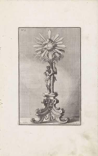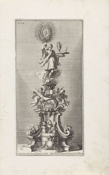 Editor: This is Maximilian Joseph Limpach's "Candlestick with Standing Angel," made in 1714. It’s currently housed in the Rijksmuseum. It’s a rather ornate engraving, but the angel gives it a light, whimsical feel. What do you make of it? Curator: I find the interplay of vertical elements striking. Note the strong central axis formed by the candlestick, effectively bisecting the composition. How does the figure of the angel interact with this rigid structure? Editor: Well, she seems to be softening it, literally and figuratively, by supporting it and breaking the strict vertical line with her wings and flowing robe. Curator: Precisely! The artist employs a compelling contrast. The geometric rigidity of the candlestick is juxtaposed with the organic form of the angel. Notice how the textures differ as well—the smooth, polished metal of the candlestick against the soft rendering of the angel’s drapery. Do you perceive any disruption in the harmony between form and function? Editor: It feels balanced to me. The angel appears integral to the design, not merely an added flourish. Her pose mirrors the curves within the candlestick’s design. Curator: Indeed. Furthermore, the cloud motif, at both the base and summit, acts as a framing device. Consider the repetition of forms—the curves of the clouds echoing those of the angel’s wings and the candlestick’s embellishments. The composition has structural integrity. Editor: I didn’t consider the cloud motifs that way before. Now I appreciate how they tie the entire composition together. Curator: This piece offers a rich demonstration of formal contrasts and structural harmonies. Paying close attention to the elements creates new insight. Editor: Thanks, I'll definitely look for that now in other pieces.