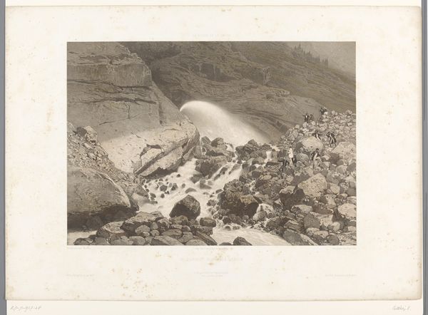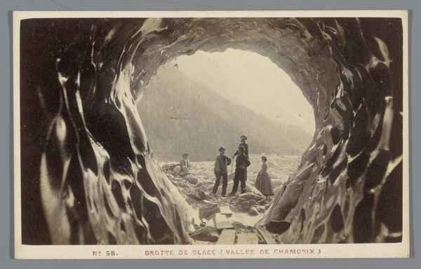 Paul Güssfeldt captured "Keizer Wilhelm II en zijn gezelschap bij een gletsjer in Noorwegen" in a photograph of modest scale. The eye is immediately drawn to the vast, softly lit glacial opening that looms over a small group of figures. The sepia tones lend a dreamlike quality to the scene. Structurally, the composition places these men at the bottom of the frame, thereby accentuating the overwhelming scale of the glacier. The texture is particularly compelling; the rough, uneven surface of the rocks contrasts with the smooth, cavernous ice. This juxtaposition highlights the sublime tension between fragility and permanence, themes often explored by Romantic painters like Caspar David Friedrich. Viewed through a semiotic lens, this image presents the glacier as a signifier of nature's indifferent power. The Kaiser and his retinue, dressed in dark, formal attire, become symbols of human ambition dwarfed by the natural world. The photograph invites a questioning of power dynamics, suggesting nature’s supremacy and underscoring humanity's transient place within the larger scheme of the planet.