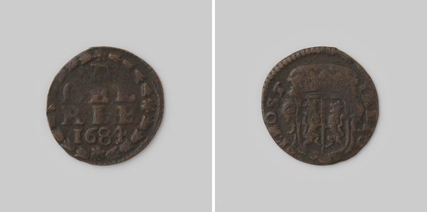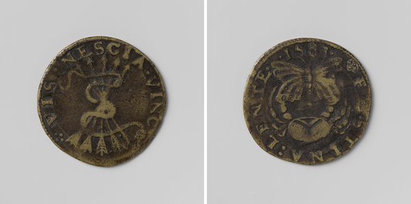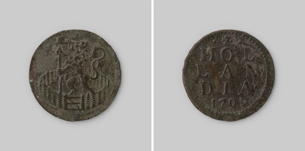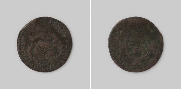 Curator: Looking at this image, my initial reaction is one of austerity and a sort of worn history. The texture and subdued color give the object a tangible, almost visceral quality. Editor: You’re right, it certainly carries its history. This is a Dutch medal in the name of Philips II, dating from 1573. It offers us a fascinating insight into the politics of the time. The relief work is rendered in metal and preserves rich iconography for us. Curator: Philips II. The resonances there are clear - power, colonialism, the Reformation. This piece, though small, becomes a flashpoint for major historical shifts and can embody various elements of identity and control from gender and class perspectives. I see echoes of current debates around representation and monuments here. Editor: Absolutely. Medals like this served a crucial role in projecting power and disseminating information. This specific medal was produced by the province of Holland, which provides valuable insight into how that specific region navigated its relationship with the Spanish crown. The lion of Holland on one side speaks to local identity. Curator: I agree. The controlled symbolism becomes a visual tool of propaganda and nation-building. But also, considering the act of holding and exchanging it - how can its function as currency inform our understanding of its use? In which scenarios did those coins become symbolic for power struggles within and between societal layers? Editor: I believe that these "Hollandse penningen," medals as we refer to them now, circulated as actual currency at the time of its minting. The images would reaffirm the power dynamics and signal resistance to foreign governance as trade would commence in the local markets. It’s a stark reminder of the intricate connections between art, power, and everyday life. Curator: It makes me wonder about the perspectives of marginalized people living in the margins. We see symbols, images, power struggles - but what was this like from their lived point of view? Editor: That’s a key question to continually bring up when examining historical artifacts. What can a coin really tell us of someone's day-to-day struggle under the political upheaval that defined this time in the Netherlands? Thank you, this exchange has provided me with so many things to consider regarding its impact.