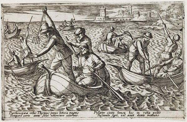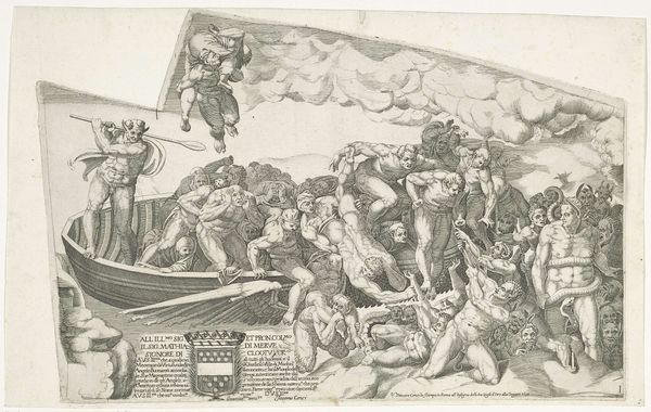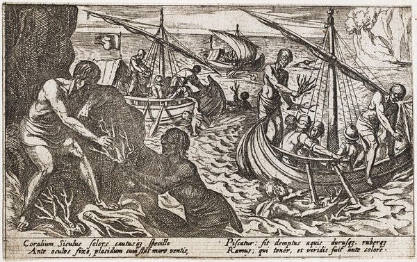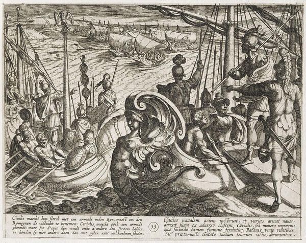 Editor: This is Adriaen Collaert's "Christopher Columbus on His Ship," a small print from the late 16th or early 17th century, held at the Harvard Art Museums. It's busy, almost chaotic with all the figures. How does the image function as a representation of Columbus in this period? Curator: It's fascinating, isn't it? Collaert presents Columbus amidst mythological figures, Neptune and mermaids, which served to legitimize Columbus's explorations within a classical framework. The image isn't just about discovery; it's about power, justifying Spain's claim to new territories by linking it to divine approval and ancient narratives. Editor: So, the classical imagery bolsters the political message? Curator: Precisely. By embedding Columbus within a mythological context, the print elevates his status and reinforces the idea of European dominance, influencing the perception of exploration. What do you make of the inscription at the bottom? Editor: It seems to praise Columbus as a terror of the Ocean, adding regions to the Spanish Kingdom. It's interesting how the image combines classical, religious, and political claims in representing Columbus. Thanks, I've learned a lot.