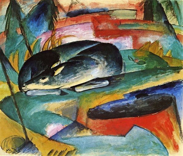 Curator: We’re looking at Franz Marc’s “Tiger,” an oil painting from 1912 currently housed at the Lenbachhaus in Munich. Editor: Wow, that yellow punches you right in the face! But somehow it's not aggressive. More like… watchful, contained. Almost sad. Curator: I agree. The composition is a series of fractured planes—greens, purples, oranges—that could suggest a jungle environment, yet they seem to confine the tiger more than liberate it. Notice how the geometric forms, typical of Marc’s Expressionist style at the time, contribute to a sense of fragmentation. Editor: It’s as if the tiger is both part of its environment and totally separate from it. All these shapes, yes, feel restrictive, or like something is off about his world. Why this particular shade of yellow, though? Curator: Well, Marc used color to evoke specific emotions and associations. Yellow, for him, often symbolized femininity and gentleness. Here, I think it highlights the animal’s inherent vulnerability beneath its fierce exterior. A stark contrast with, say, the powerful, masculine connotations of blue that he favored. Editor: I like that. The fragmented landscape echoes the interior life of the tiger itself; as if what happens on the outside reflects feelings on the inside. Almost like he's been caught up between what he wants and how the world lets him express it. A battle within himself... Makes one contemplate his mental condition as it goes far from simple instinct and wildlife behavior. Curator: Exactly! Marc aimed to reveal the spiritual essence of animals. There's such intensity conveyed using this palette. What remains so affecting after more than a century, I find, is not simply the vibrant surface, but what it communicates regarding the interconnectedness between all living beings and the landscapes around them. Editor: Beautifully put. He paints an emotional landscape using animals rather than figures and reveals some hidden feeling. Something we could be feeling but couldn’t name. And there’s some kind of peace within these contrasts. Fascinating.