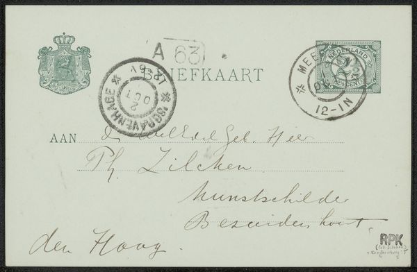 Curator: What a captivating glimpse into the past. Here we have "Briefkaart aan Jan Veth," dating back to before 1885, created by Chap van Deventer using pen and ink. It’s essentially a beautifully crafted postcard. Editor: It feels so intimate. Like stumbling upon someone’s private thoughts or a quickly scribbled message. The casual nature makes you wonder about the lives and relationships it briefly illuminates. Curator: Indeed, the fact that it's a handwritten note transforms it into something profoundly personal. As an activist, what resonances do you pick up on from the piece? Editor: Well, looking at the address of the recipient, Mr. John P. Veth—'oil painter' it declares! It raises questions about artistic networks in the Netherlands during that period. How artists supported each other, shared ideas, and negotiated their identities within a rapidly changing social and political landscape. Epistolary exchanges such as these functioned as vital conduits within artistic communities, enabling vital flows of both creative and socio-political discourse. Curator: The flowing lines and elegant script are particularly striking. There is something both utilitarian and graceful. A very human sensibility. Editor: It’s that tension between the practical function of a message—addressing someone at the Hotel Hamdorf—and the deliberate aesthetic choices that gets to me. The almost ornamental quality in some of the lettering suggests an intentional artistic touch that elevates it beyond mere communication. Even now, handwriting is slowly being turned into an act of resistance of a kind. Curator: Absolutely. Perhaps Van Deventer wanted to gift Veth with a miniature work of art in its own right, however modest. The swirls in the name. The flourishes beneath "BRIEFKAART"... they signal thoughtfulness, care and aesthetic intention. It speaks volumes about artistic practices that are interwoven through the everyday acts of correspondence. I find the contrast of the various gothic looking stamps particularly interesting. Editor: Agreed. These stamps act almost like visual punctuation, anchoring the entire composition with traces of the socio-political realities of the period. How notions of identity and belonging may intersect in such intimate forms of exchange is of real interest, both then and now. Curator: Seeing this now makes you pause and consider who created this small piece of history and its intended recipient. A tiny act, frozen in time. Editor: Yes, an everyday artifact that lets us ponder the intimate exchanges shaping art history.